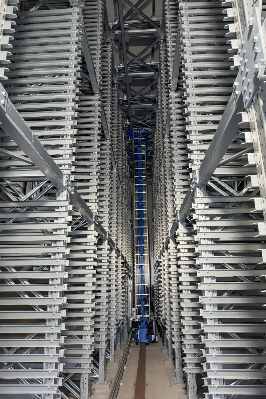 The solution is based on Vertilog VL technology, an industrial vertical storage system with dynamic tray-based storage, served by an internal stacker crane that automatically manages storage and retrieval operations by transferring materials to operational bays. The system enables fully automated cycle management, ensuring continuity and control of material flows.