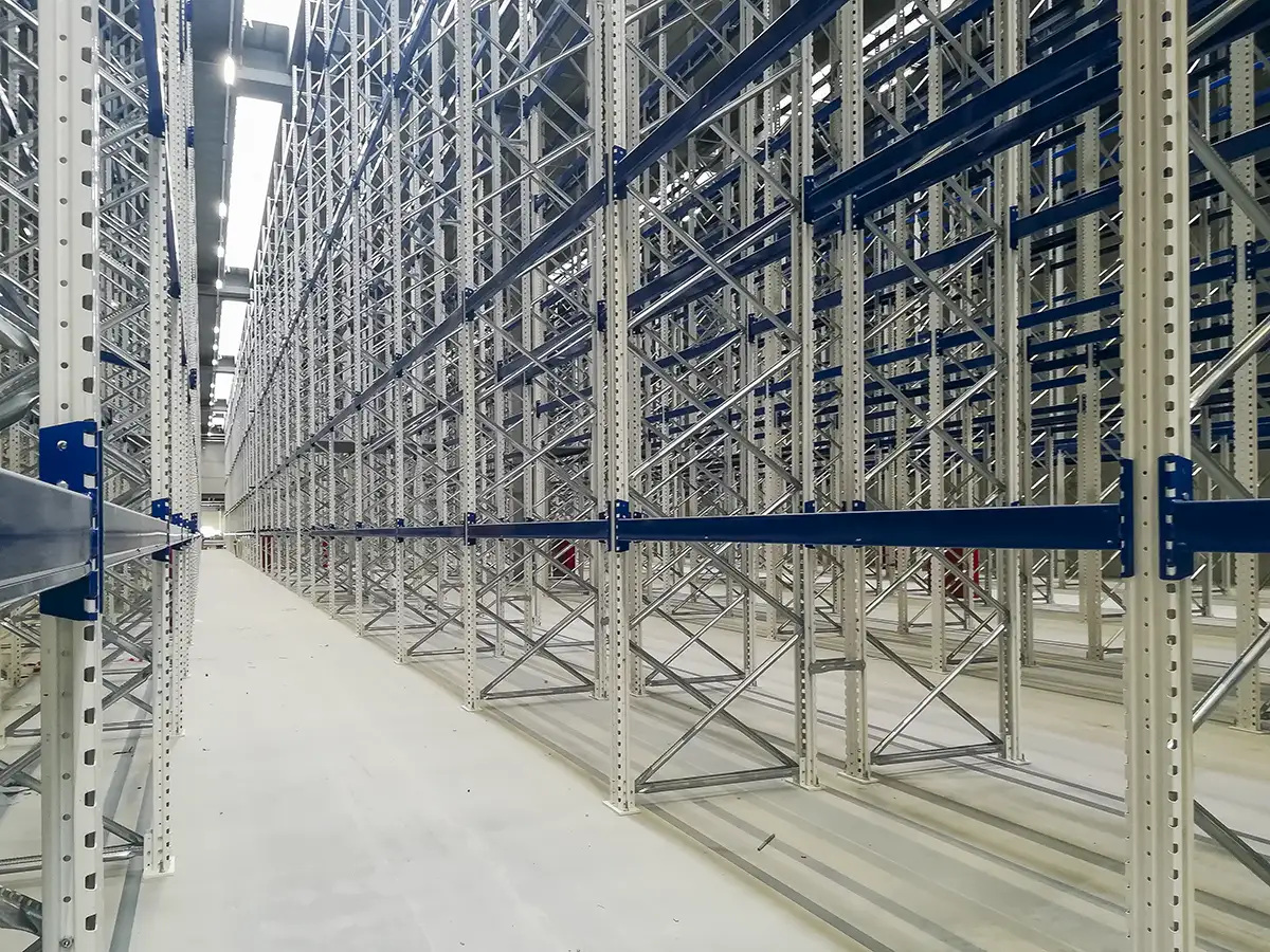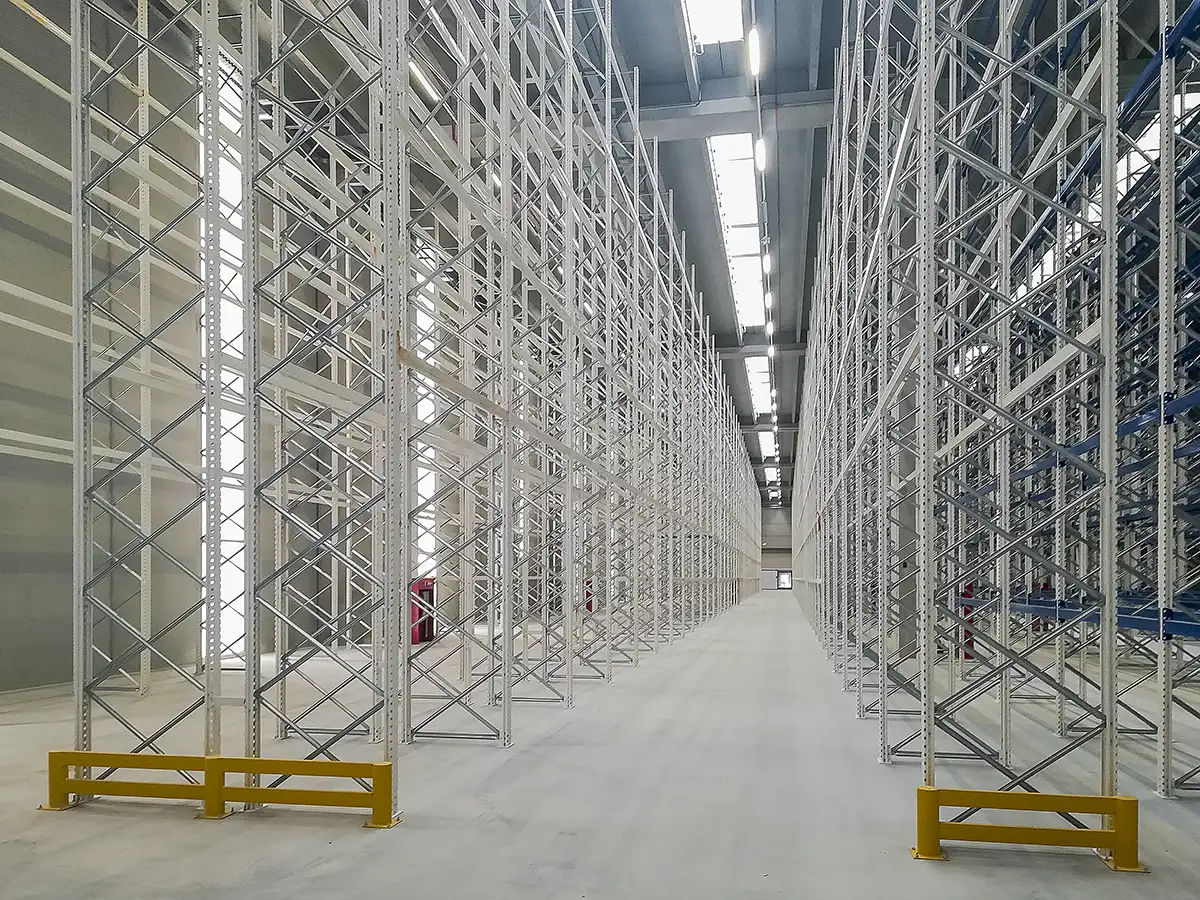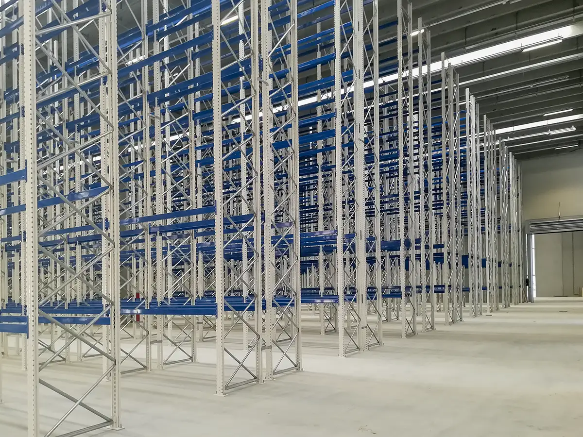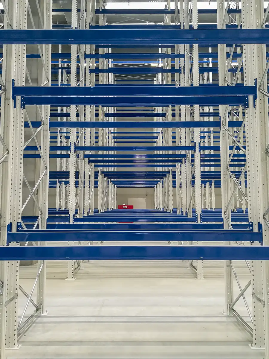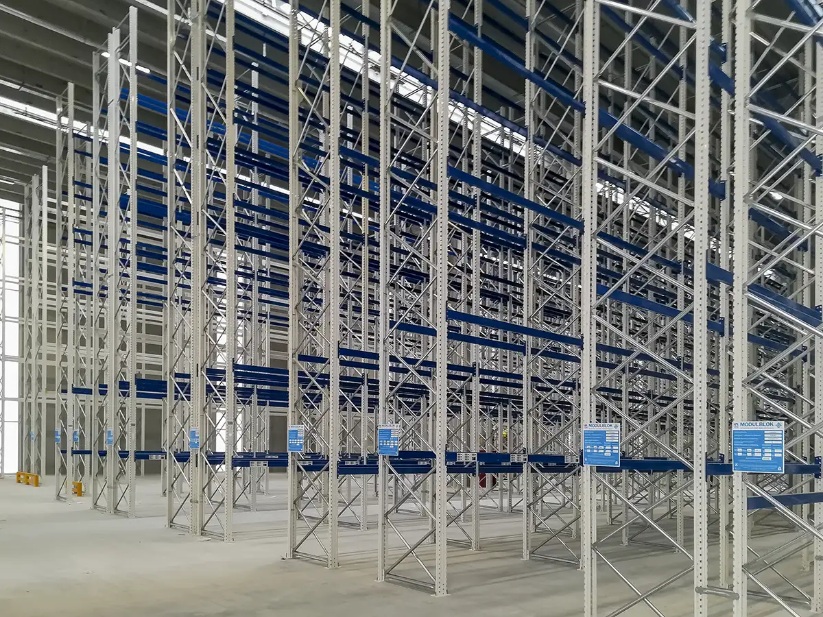 Modulblok ha progettato e realizzato un sistema di scaffalature porta pallet organizzato per aree funzionali e livelli di servizio diversi, con integrazione di rulliera automatizzata e baie IN-OUT automatiche nelle zone a maggiore intensità di flusso.